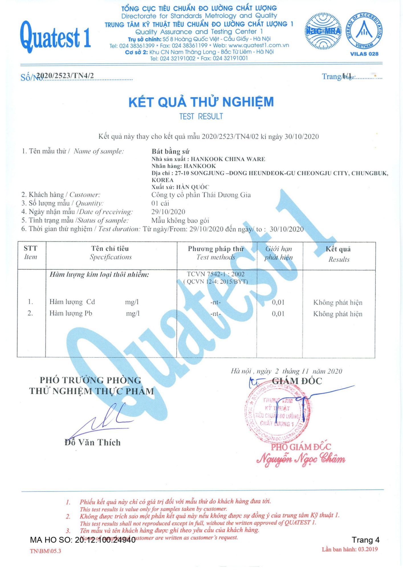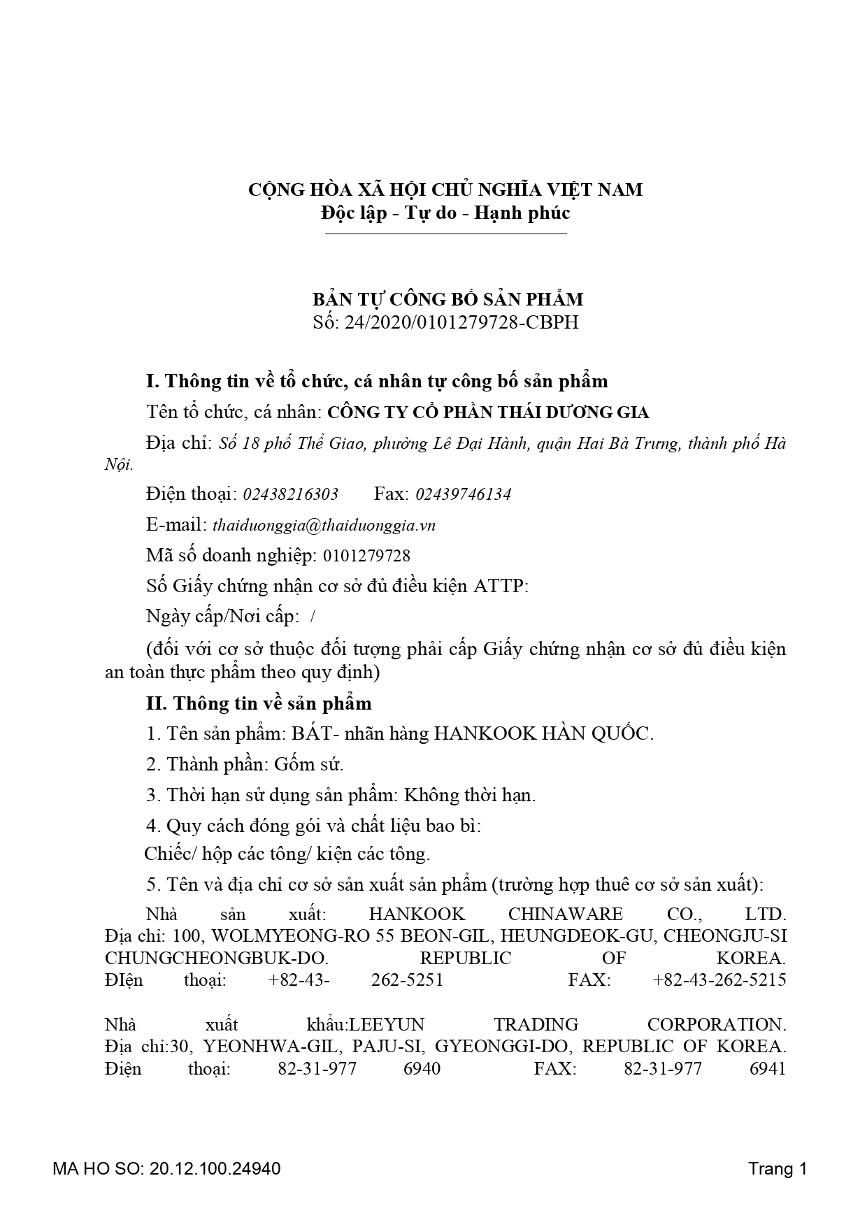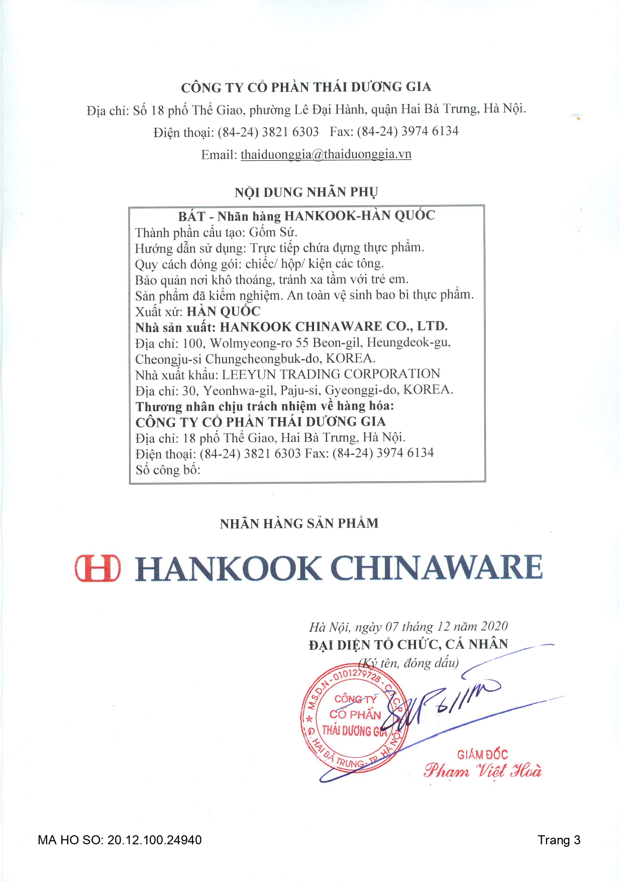 CÔNG TY CỔ PHẦN THÁI DƯƠNG GIA tự hào giới thiệu Bát - nhãn hàng HANKOOK HÀN QUỐC đã được tự công bố sản phẩm theo quy định của pháp luật Việt Nam về an toàn thực phẩm.