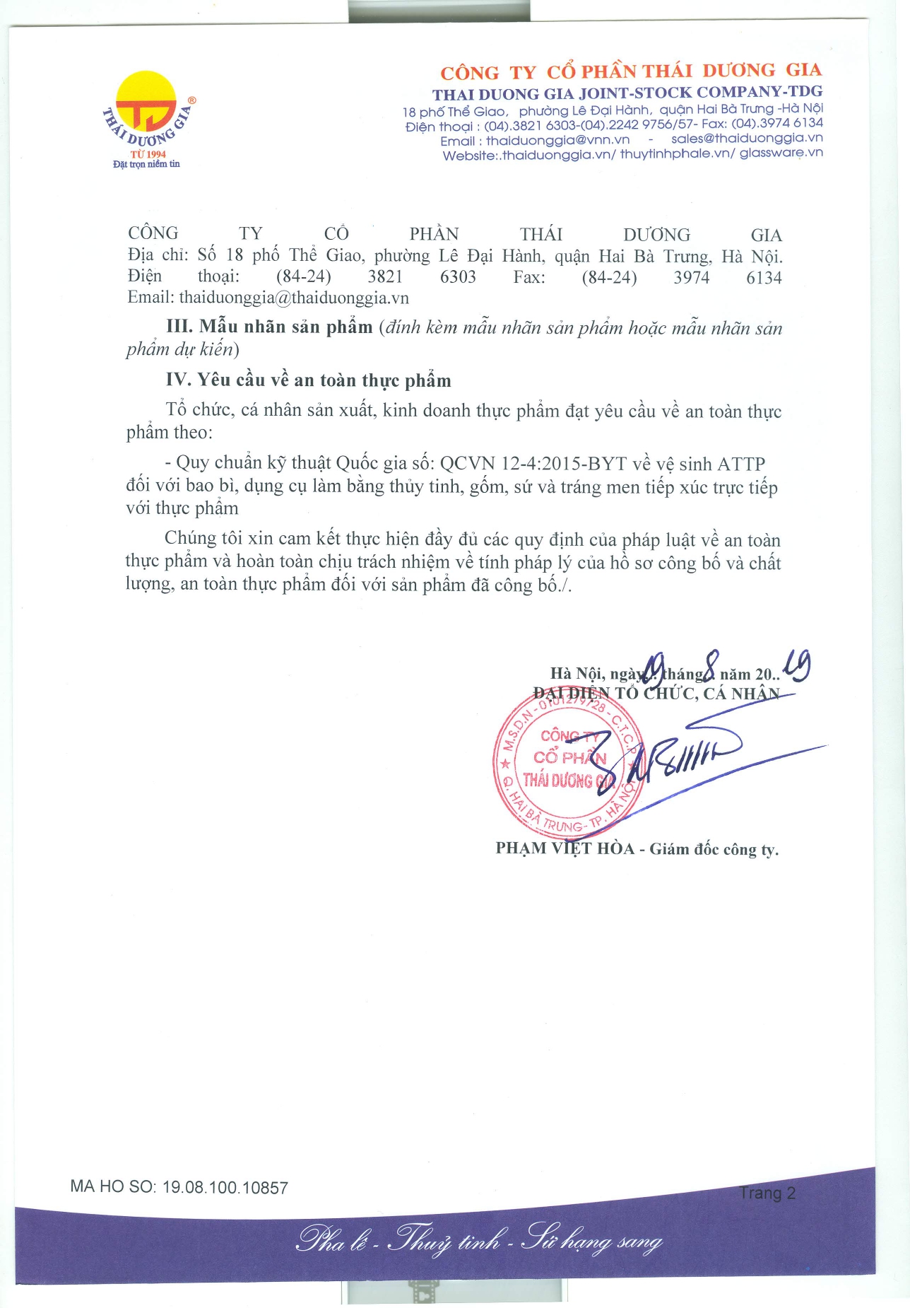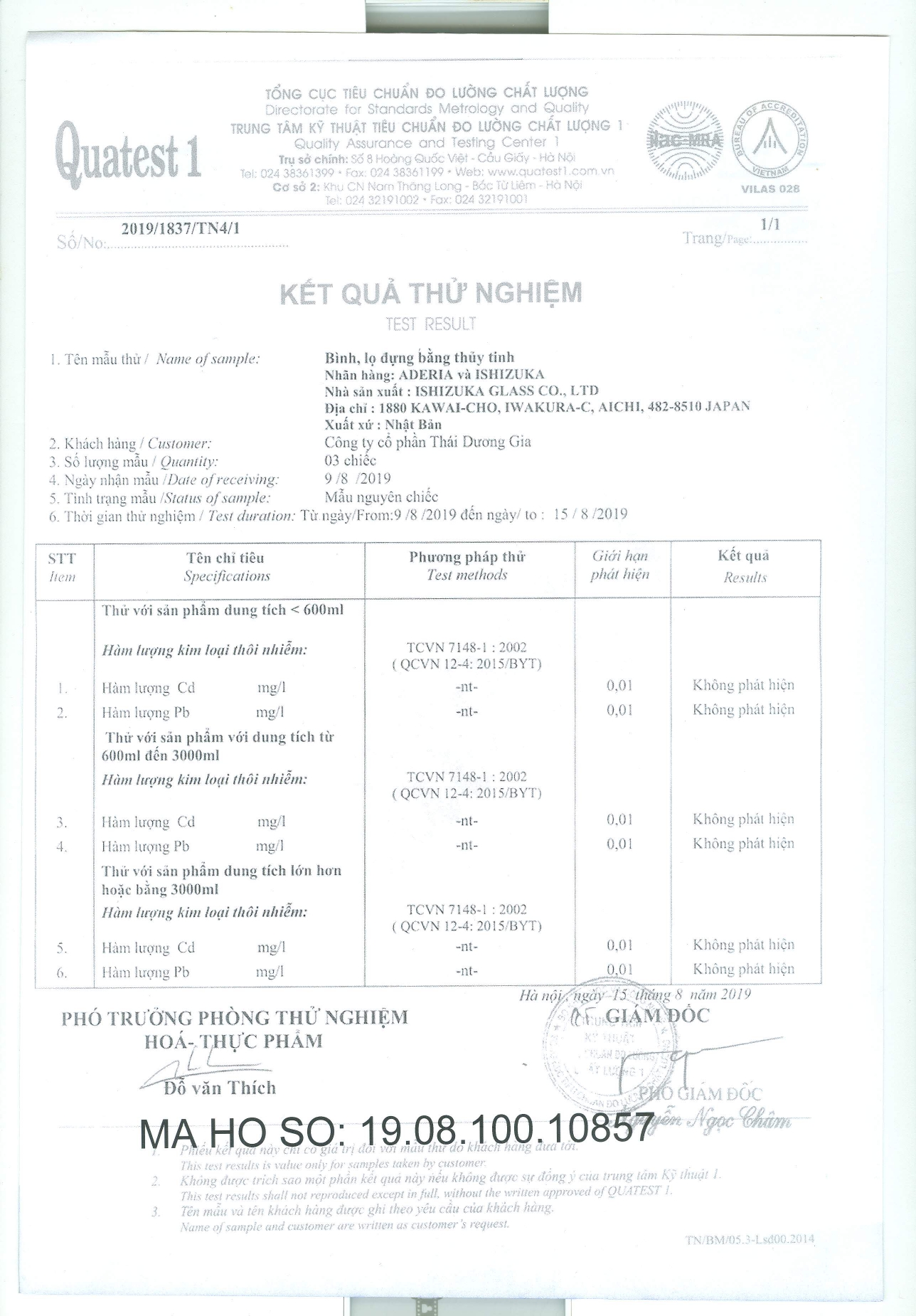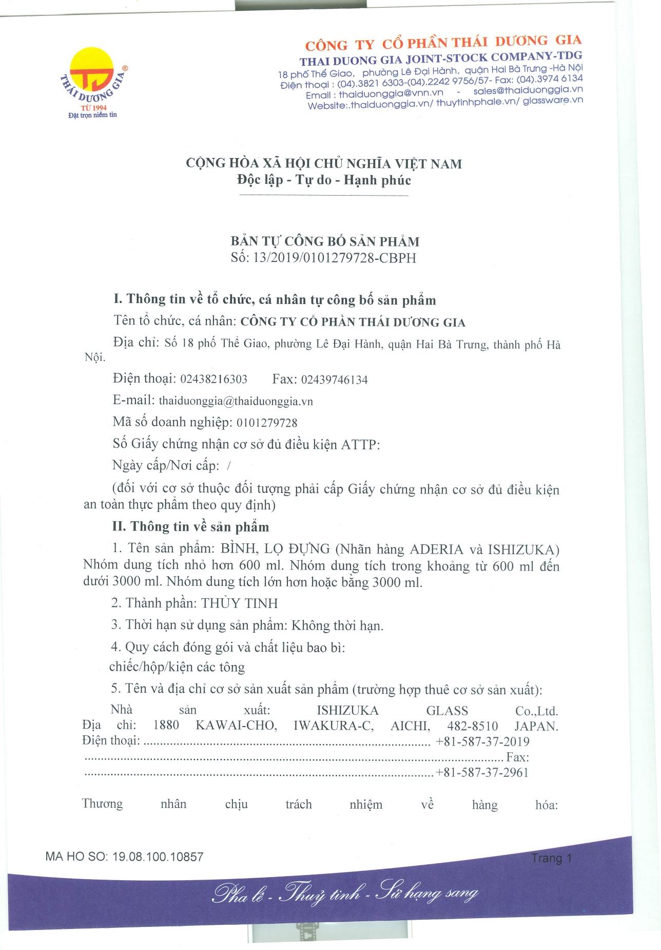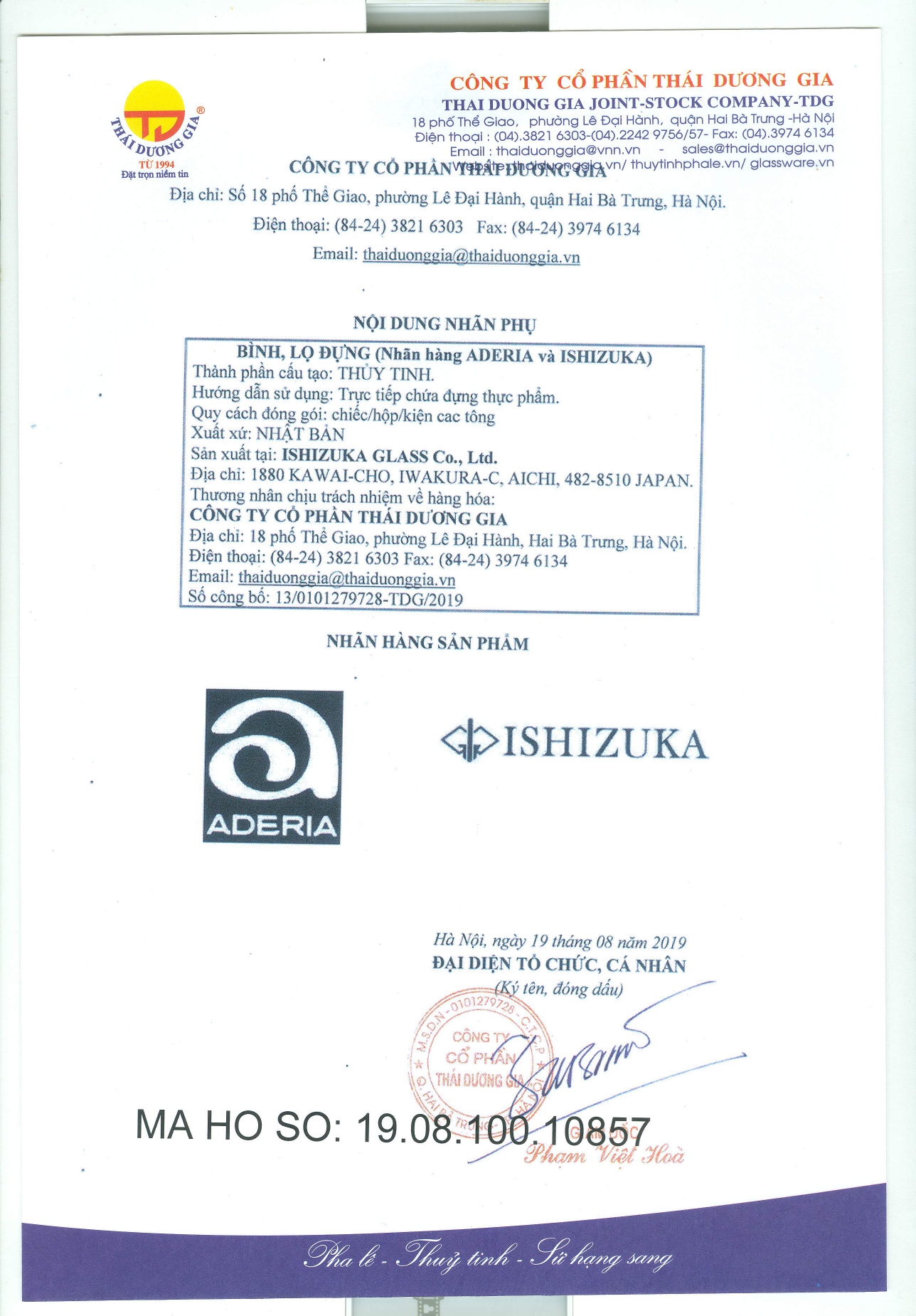 CÔNG TY CỔ PHẦN THÁI DƯƠNG GIA xin trân trọng giới thiệu Bình – Lọ đựng thủy tinh nhãn hàng ADERIA & ISHIZUKA Nhật Bản đã được tự công bố sản phẩm và kiểm nghiệm chất lượng theo đúng quy định của pháp luật Việt Nam về an toàn thực phẩm.