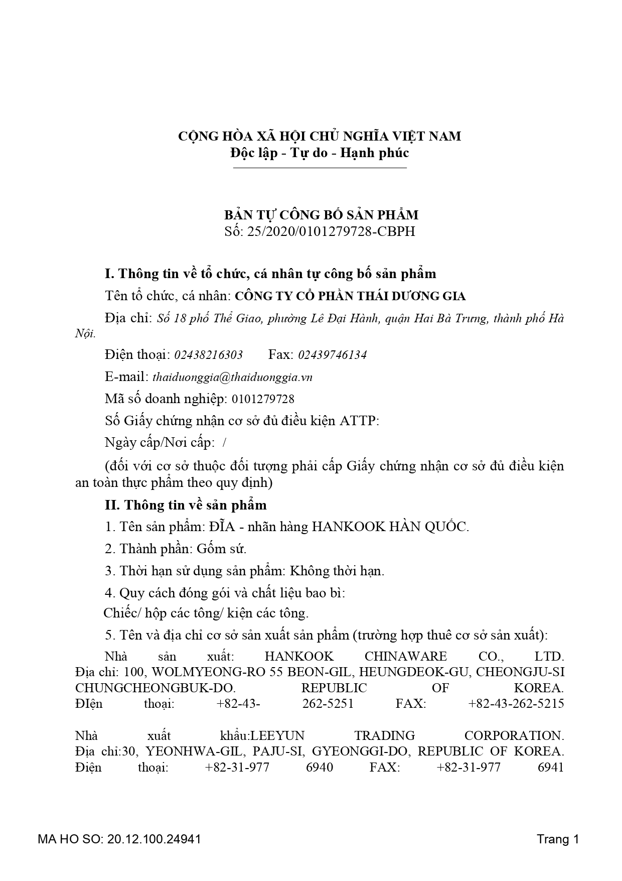 CÔNG TY CỔ PHẦN THÁI DƯƠNG GIA xin trân trọng giới thiệu Đĩa - nhãn hàng HANKOOK HÀN QUỐC đã được tự công bố sản phẩm và kiểm nghiệm chất lượng theo đúng quy định của pháp luật Việt Nam về an toàn thực phẩm.