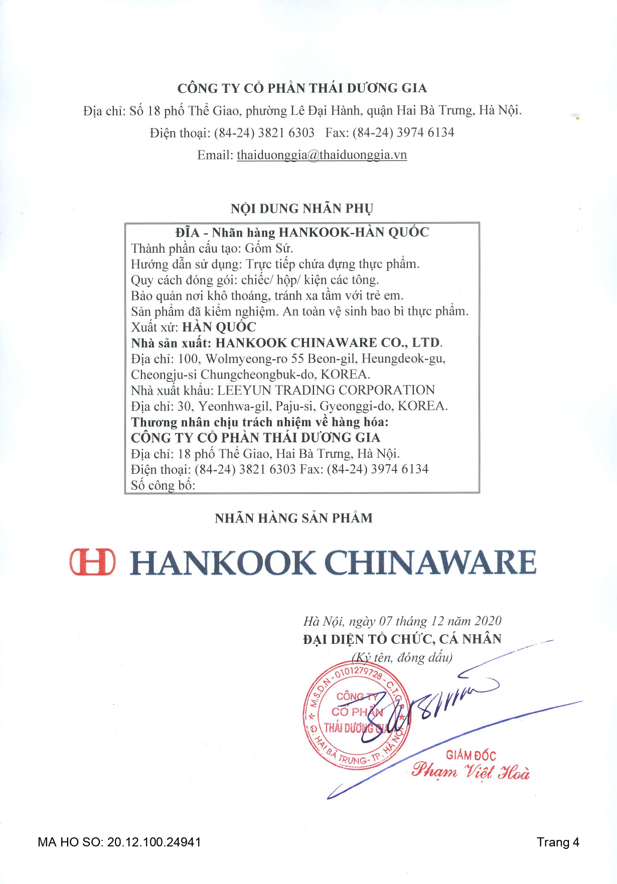 Nhà sản xuất: HANKOOK Chinaware Co., Ltd - Hàn Quốc