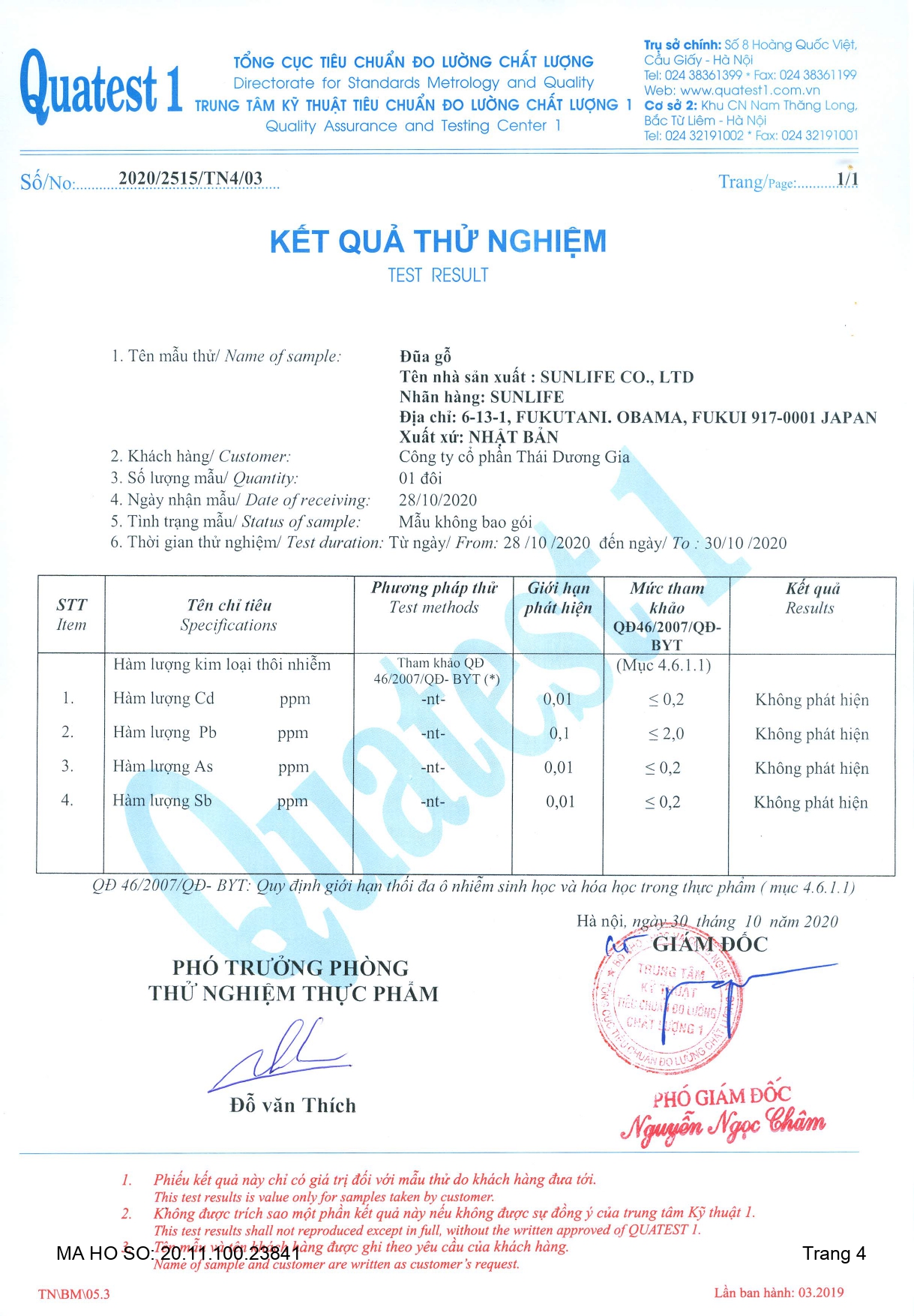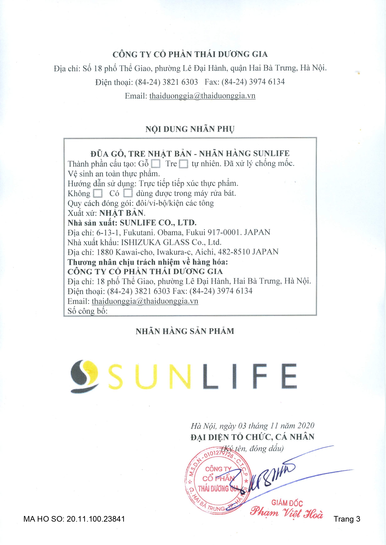 CÔNG TY CỔ PHẦN THÁI DƯƠNG GIA xin trân trọng giới thiệu Đũa Gỗ, Tre – nhãn hàng SUNLIFE Nhật Bản đã được tự công bố sản phẩm và kiểm nghiệm chất lượng theo đúng quy định của pháp luật Việt Nam về an toàn thực phẩm.
