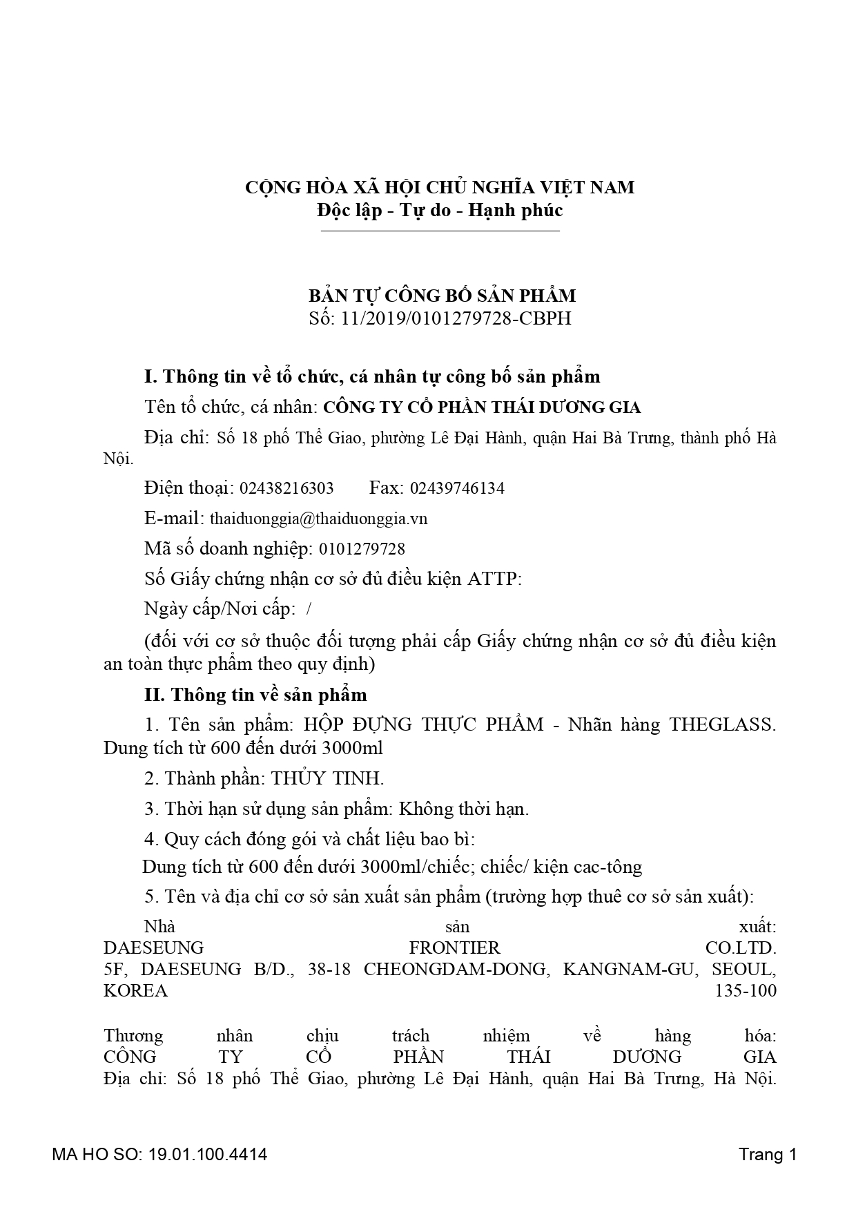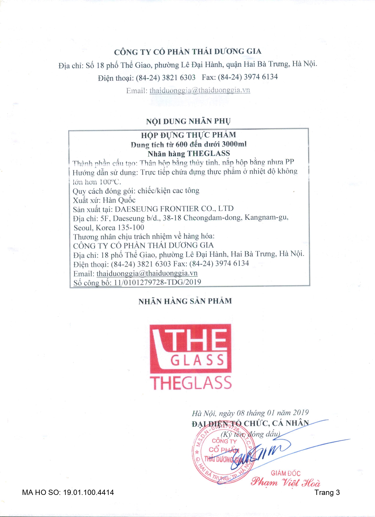 CÔNG TY CỔ PHẦN THÁI DƯƠNG GIA xin trân trọng giới thiệu sản phẩm Hộp đựng thực phẩm bằng thủy tinh - nhãn hàng THEGLASS Hàn Quốc đã được tự công bố sản phẩm và kiểm nghiệm chất lượng theo đúng quy định của pháp luật Việt Nam về an toàn thực phẩm.