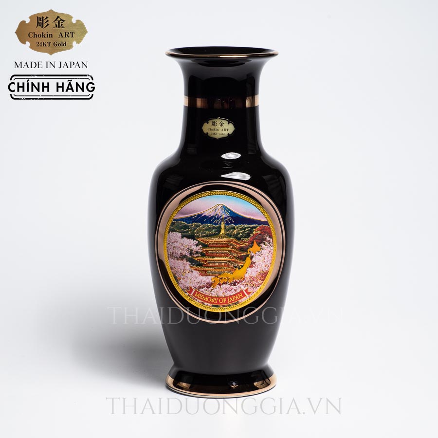 Lọ hoa khảm vàng 25cm Chokin Nhật Bản khắc tháp và hoa anh đào