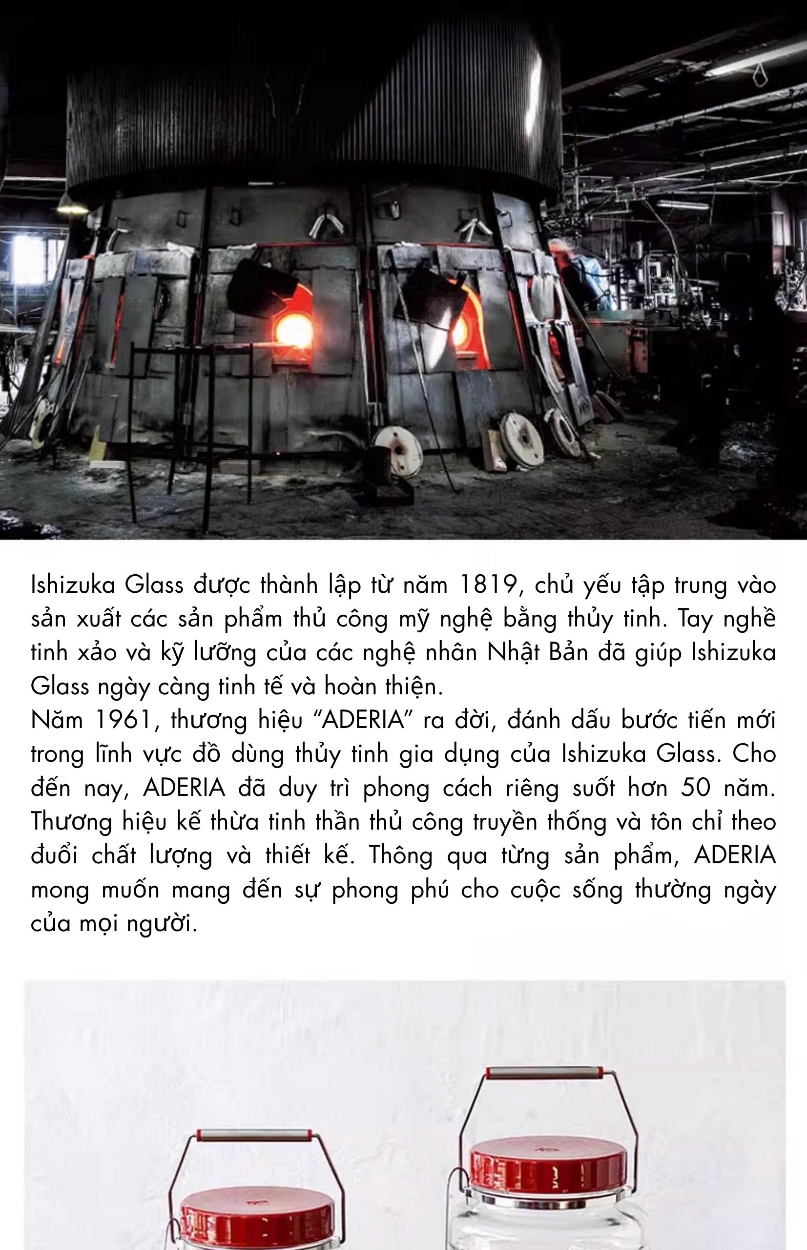 Aderia Co., Ltd. là công ty con của Ishizuka Glass Group. Đây là công ty có lịch sử 200 năm kể từ năm 1819 và có bắt nguồn từ việc sản xuất thủy tinh. Sau khi việc kinh doanh chai lọ thủy tinh ngày càng mở rộng và phát triển, họ đã tham gia vào lĩnh vực kinh doanh đồ gia dụng nhà bếp, lúc đó “ADERIA” ra đời.