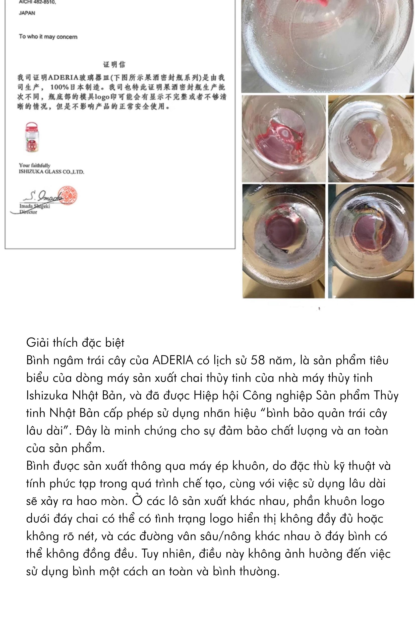 CHẤT LIỆU CAO CẤP VÀ AN TOÀN: Bình ngâm Aderia được làm từ thủy tinh cao cấp được sản xuất bằng máy móc hiện đại của Nhật Bản. An toàn cho sức khỏe, không chì, không cadmium, không BPA, và không có chất gây hại.